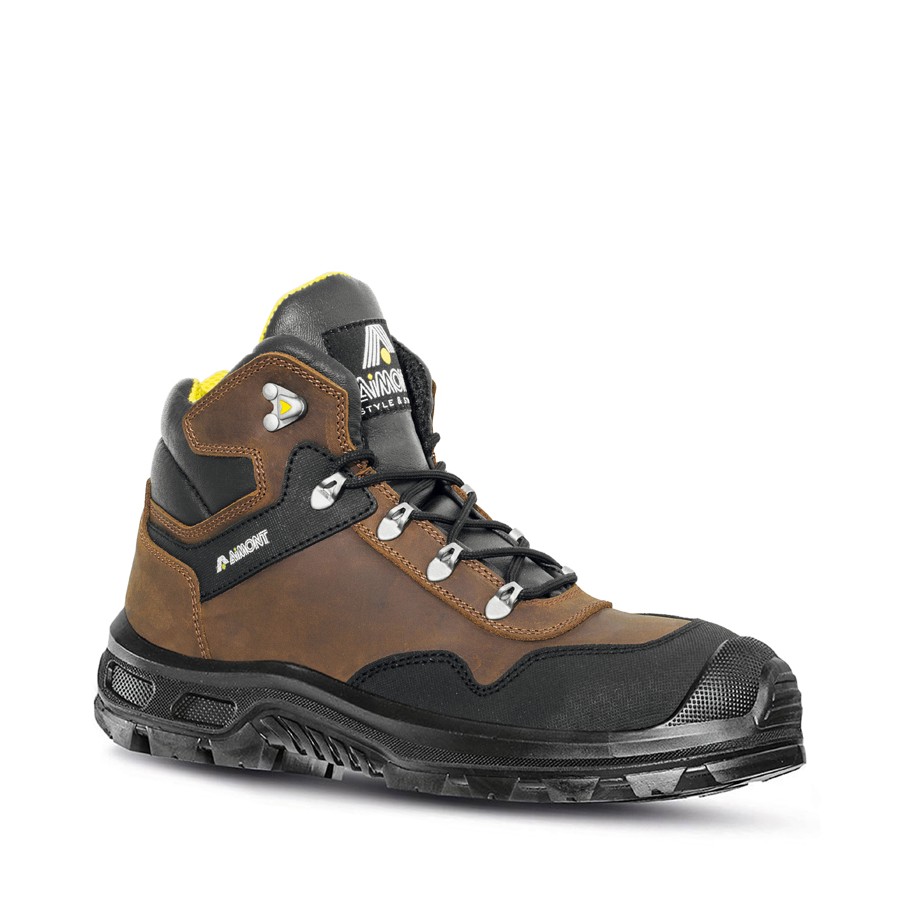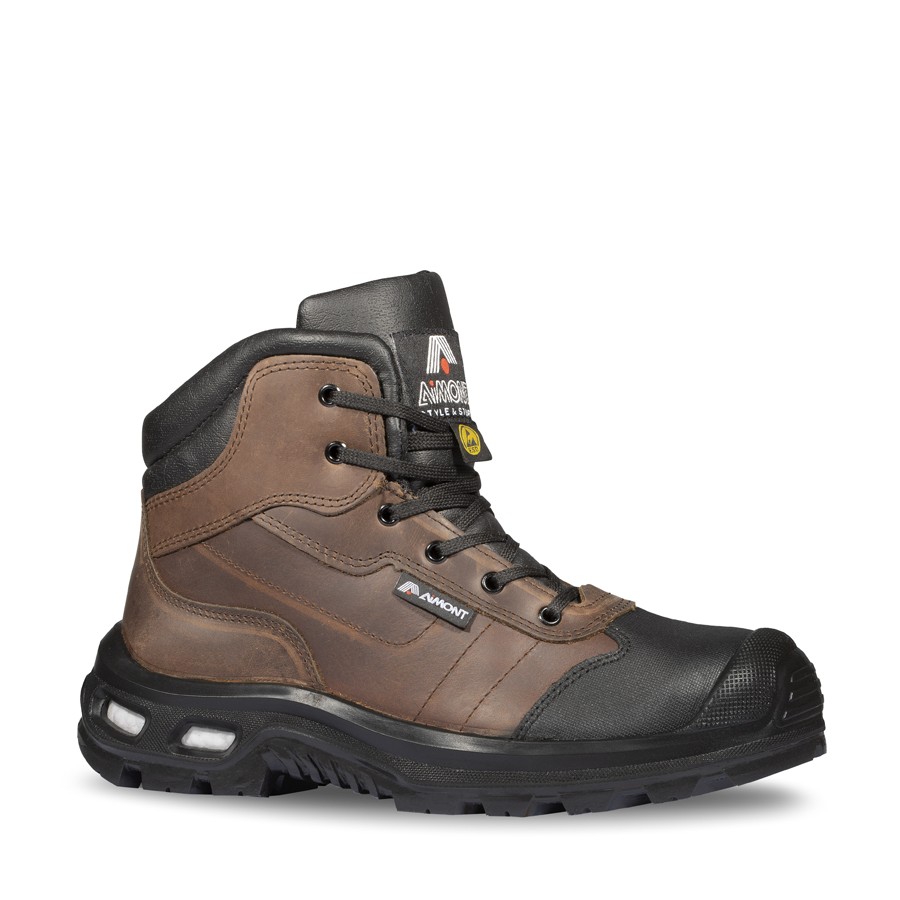 Chaussure de sécurité montante, de type trekking, coloris marron /noir, antistatique, respirante et durable.